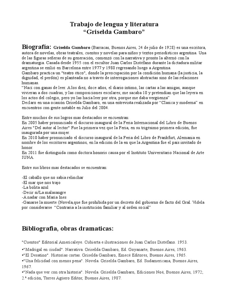 Frente a la irracionalidad de un totalitarismo que no se vale de palabras las palabras no valen. She like other authors that have lived in an oppressed country. La argentina Griselda Gambaro se encuentra entre los ms relevantes dramaturgos latinoamericanos.