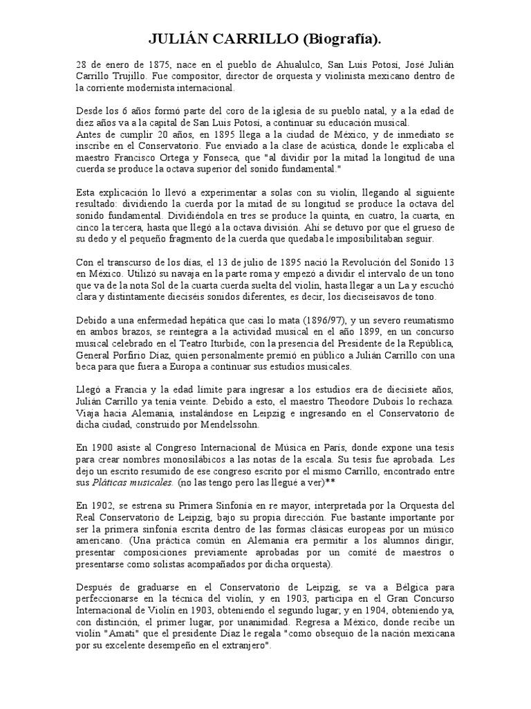 Julian carrillo biografia resumida. Carrillo begann 1885 in San Luis Potos bei Flavio F. Julin Carrillo 1875-1965 Naci en 1875 en un pequeo y remoto poblado de San Luis Potos. Fue creador de grandes obras musicales y autor del sistema musical microntervlico que llam.