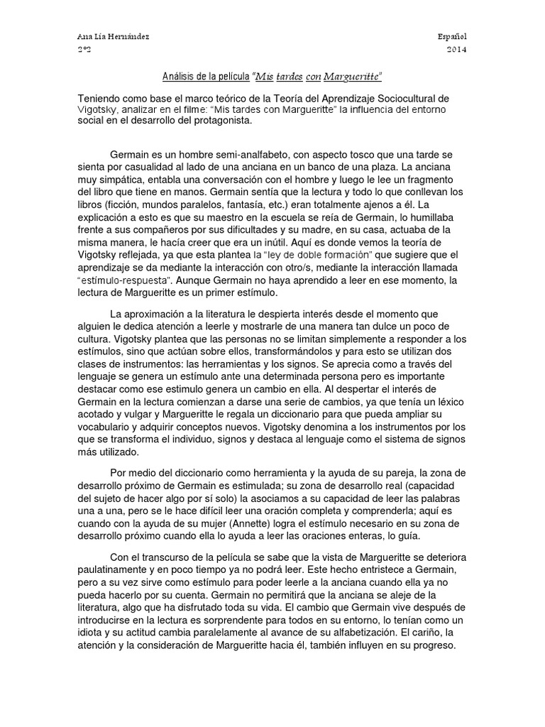 Y Margueritte una frgil anciana apasionada por la lectura. Mis tardes con Margueritte. Ana La Hernndez Espaol 22 2014 Anlisis de la pelcula Mis tardes con Margueritte Teniendo como base el marco terico de la Teora del Aprendizaje Sociocultural de Vigotsky analizar en el filme.