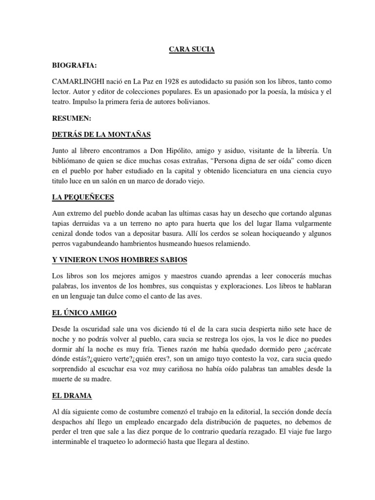 La novela narra la vida de Constanza casada con un hombre de clase alta parapljico por su participacin en la guerra. Resumen de la obra cara sucia - Brainlylat. En 1962 Jos Camarlingui publica la primera novela corta de la literatura infantil boliviana Cara Sucia.